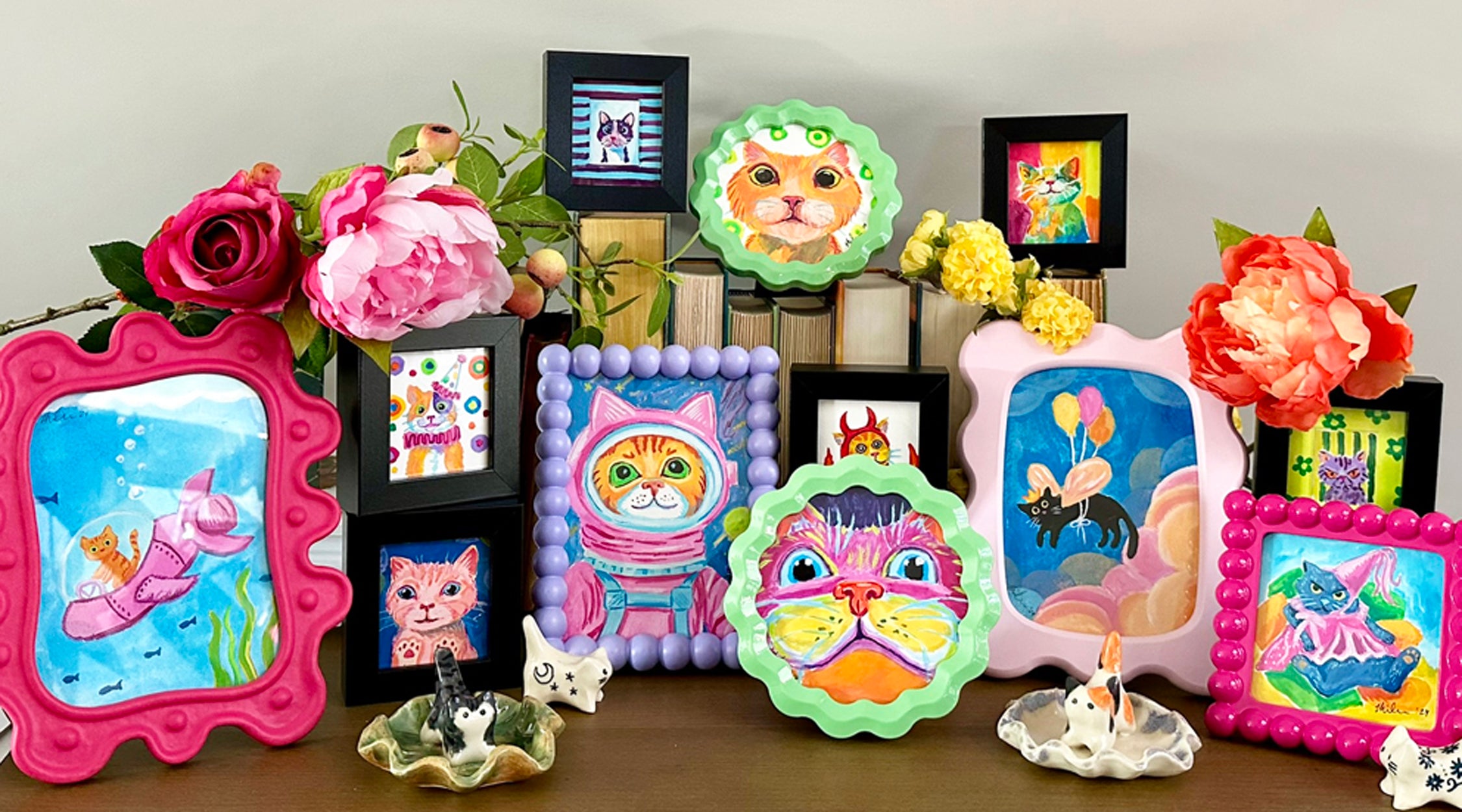 I enjoy switching between mediums as my mood sees fit. My original paintings are made with professional grade watercolors, gouache, or acryla gouache. I make my ceramics at a local studio where I occasionally teach and do technical work. My pieces are made with a sense of play and snippets of daydreams.